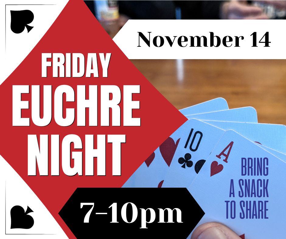 Euchre Night is held at the church every second Friday of the month starting at 7:00pm. The next Euchre night will be held next Friday, November 14th. If you are interested in having fun then come on out and play cards with us!