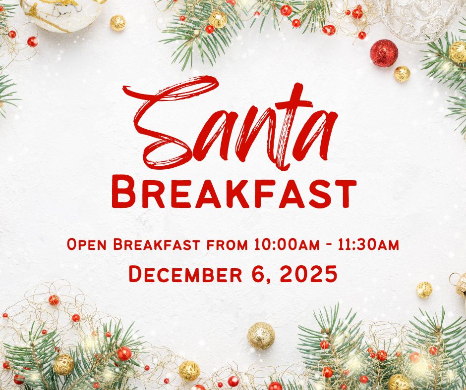 Bring the whole family to our festive Santa Breakfast on Saturday, December 6, 2025, starting at 10:00 AM! Enjoy a morning filled with holiday cheer—see Santa, have breakfast, do fun crafts, and get your picture taken! Breakfast will be served from 10:00 AM to 11:30 AM, and while the event is completely free, a free will offering will be accepted. Don’t miss this joyful kickoff to the Christmas season!