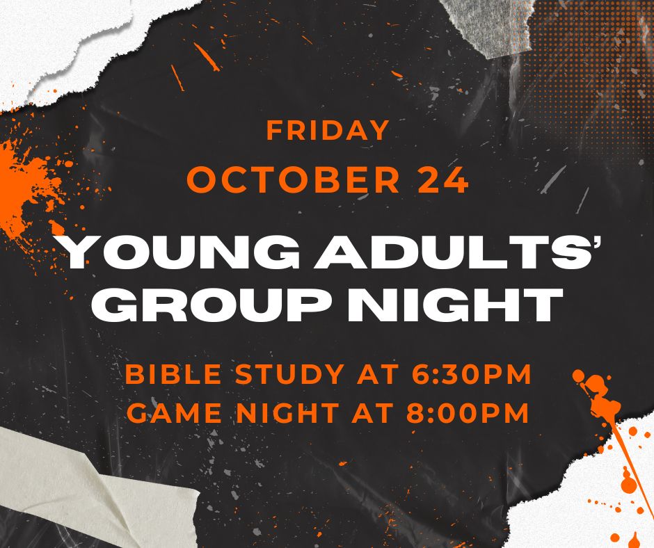 Join the young adults group on Friday,October 24, 2025.Bible Study & Pizza at 6:30pm and Game Night at 8:00pm.Bring a friend and come join us!