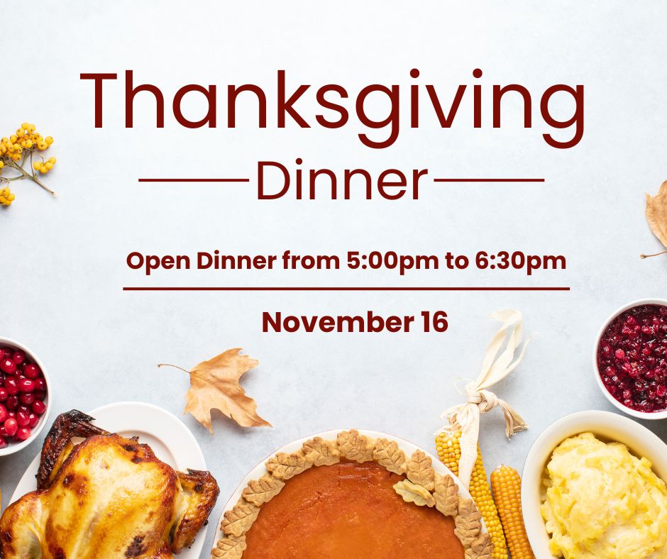 Join us for a warm and festive Thanksgiving Dinner on Sunday, November 16, 2025, starting at 5:00 PM. For just $20 per adult and $10 for children 15 and under, enjoy a full traditional Thanksgiving meal. Dinner will be served from 5:00 PM to 6:30 PM, with time to relax and enjoy family and fellowship until 8:00 PM. Come hungry and ready to celebrate the season together!